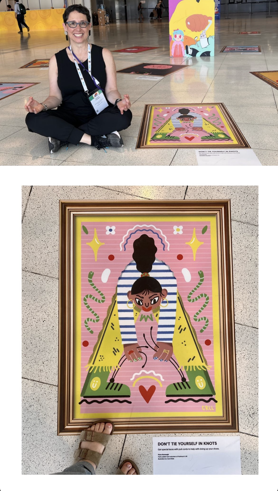The illustration has been displayed as part of a collective exhibition in Barcelona arranged on the ground, as it is designed to make it easier for individuals with Parkinson's to observe objects at a lower level.